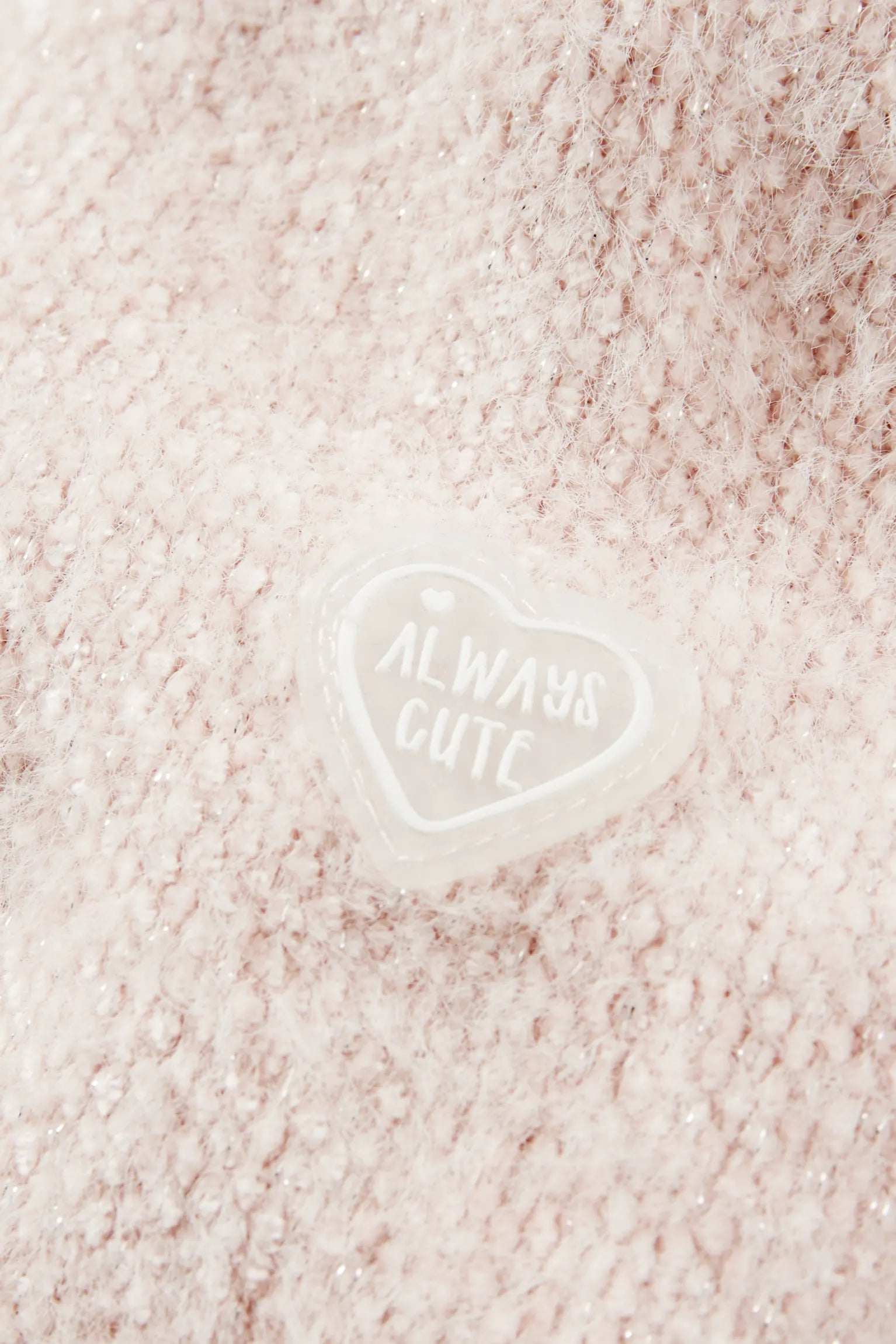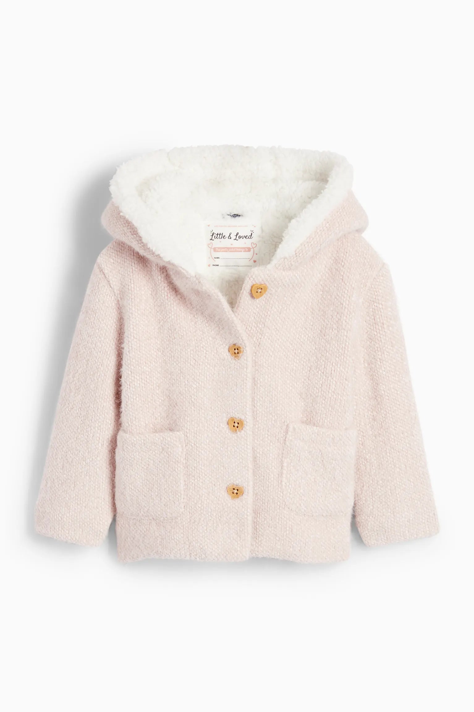 Baby cardigan with metallic yarn worked in and warm teddy fur lining.