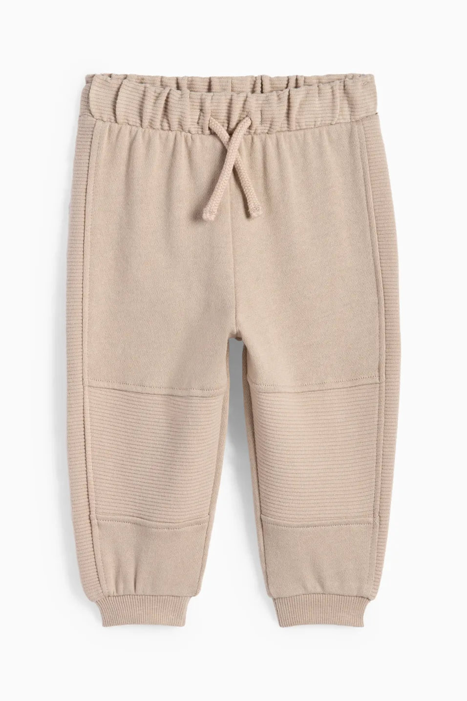 Baby outfit in soft quality. Sweatshirt with bear print and lettering, ribbed cuffs and press studs in the neck area. Quilted quilted vest with ribbed structure and hood. Sweatpants with ribbed inserts, elastic waistband, indicated drawstring and stretchy leg cuffs.