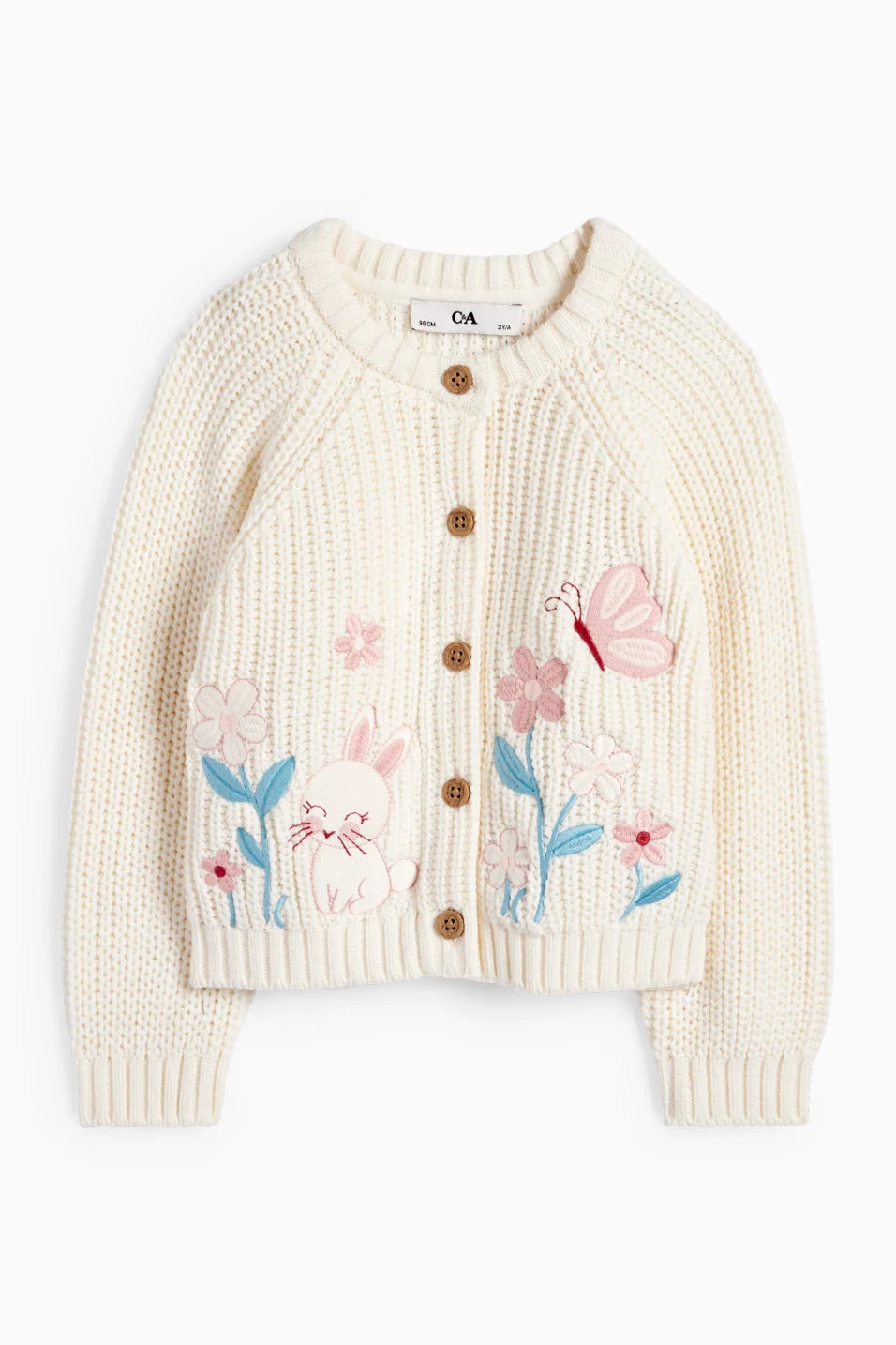 Cardigan in soft quality with rib structure. Bunny, butterfly and flower embroidery on the front as well as ribbed cuffs.