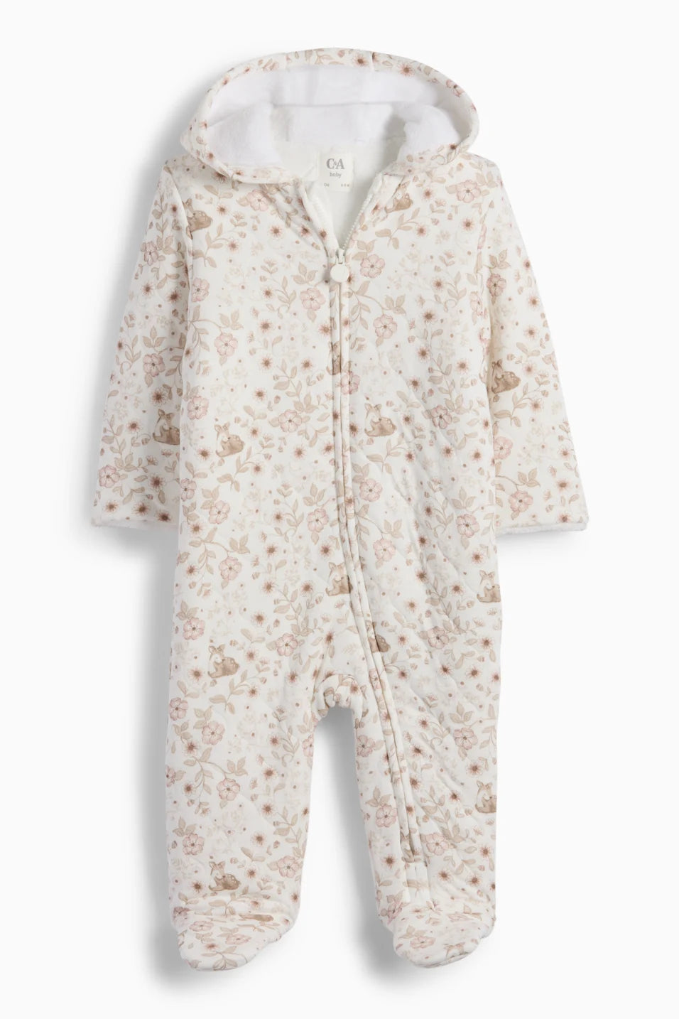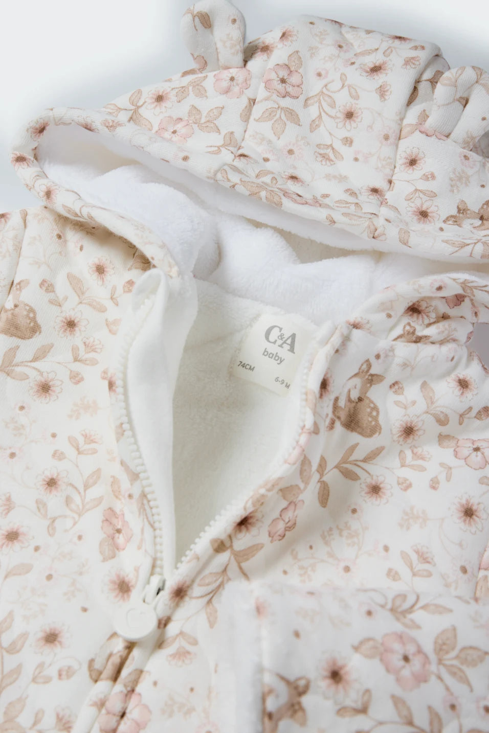 Baby jumpsuit in soft jersey with fawn and flower print. Hood with ear application, side zipper and cuddly plush lining.