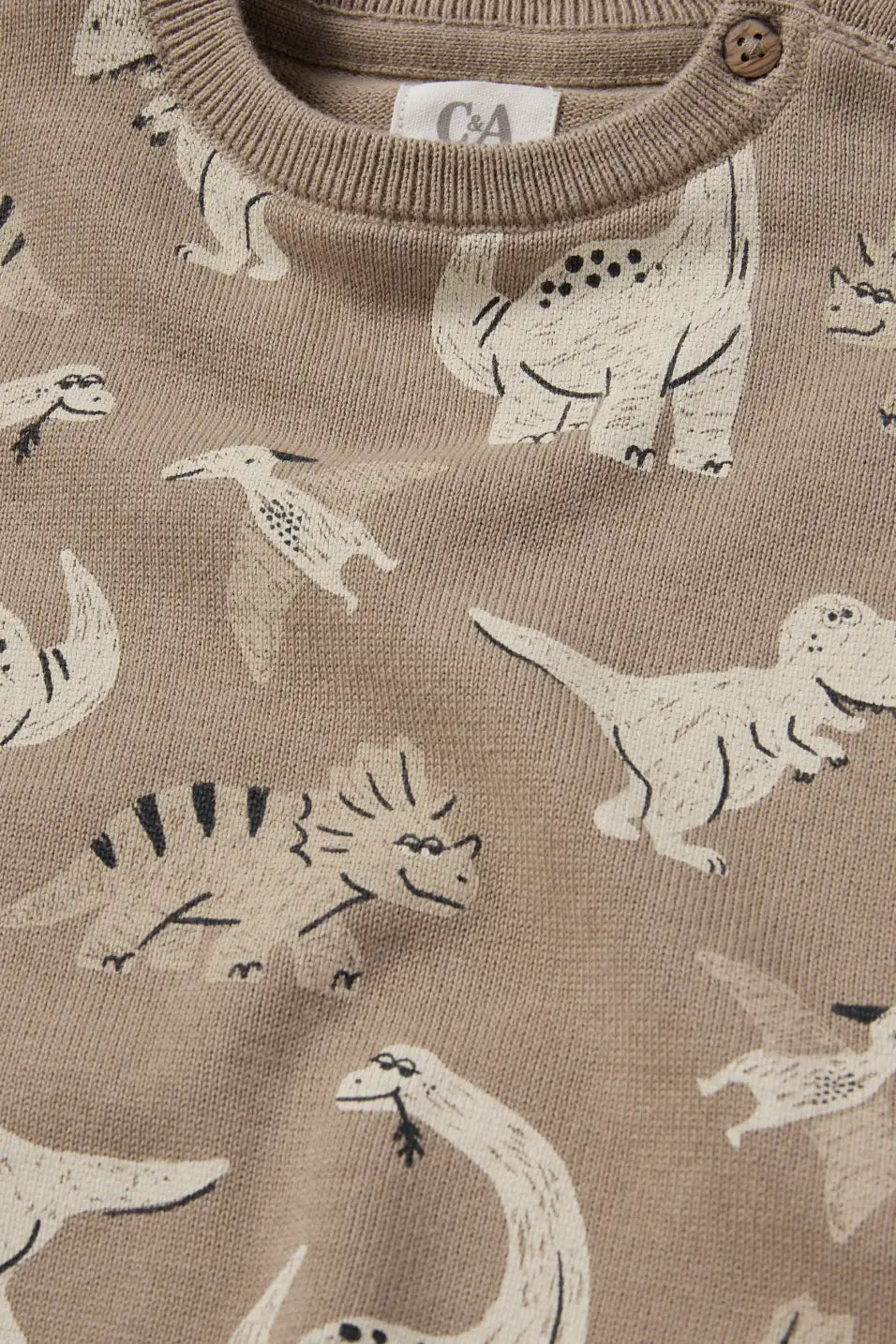 Baby sweater in light quality with dino print. Two buttons on the side of the neckline and ribbed cuffs.