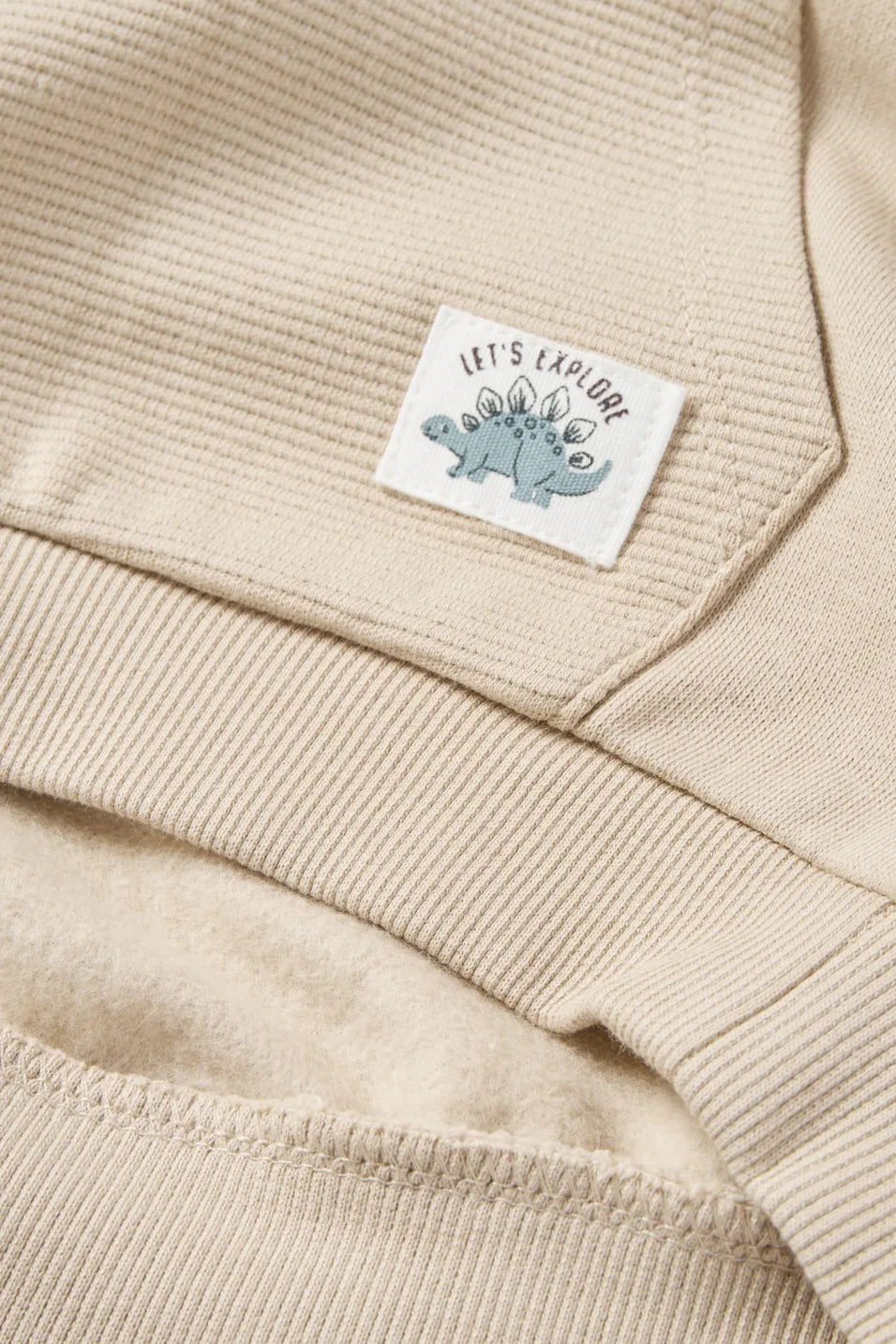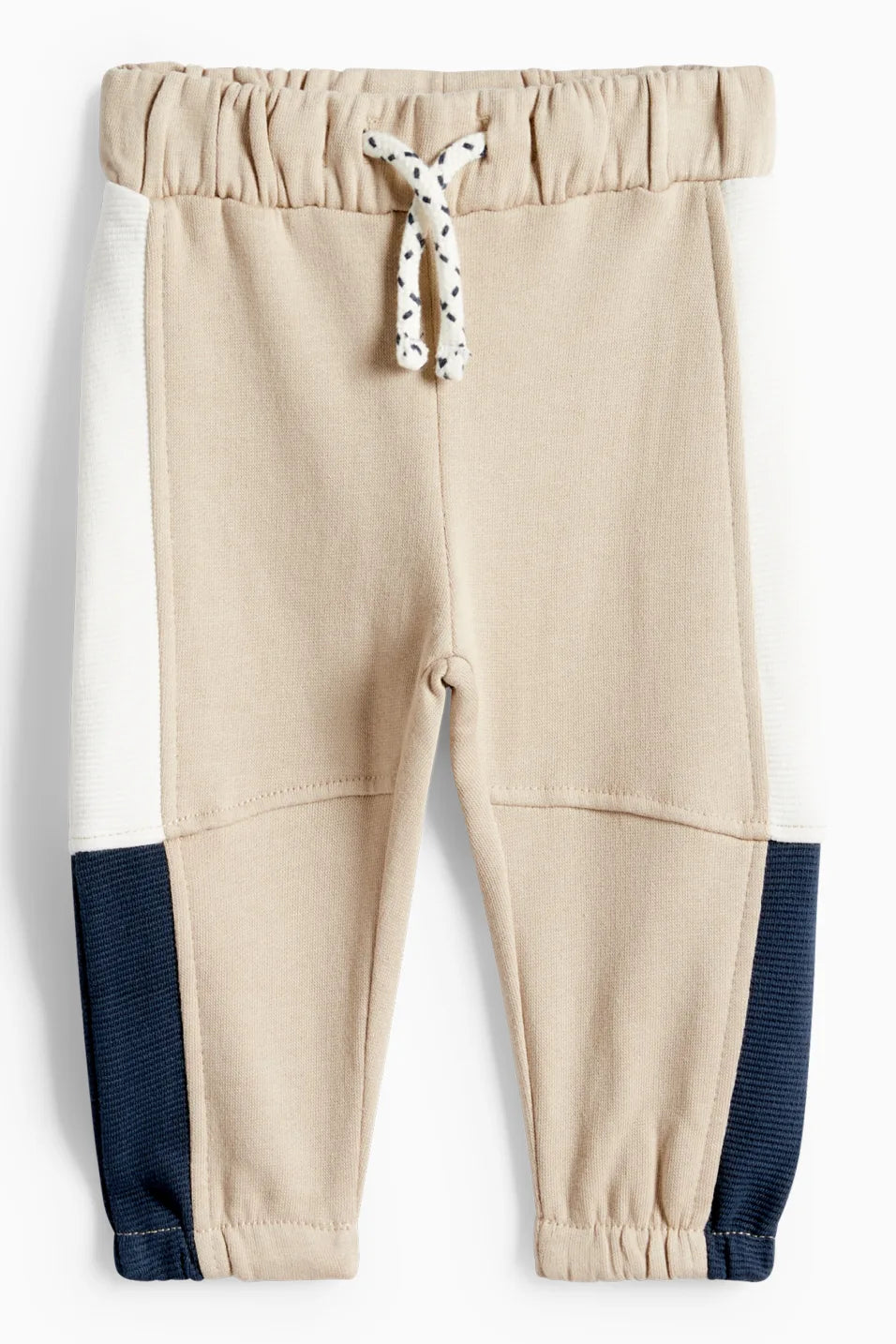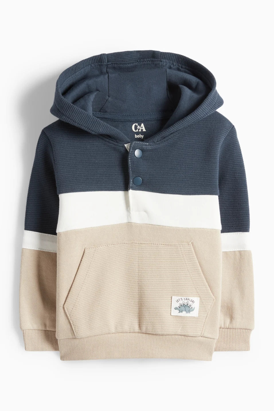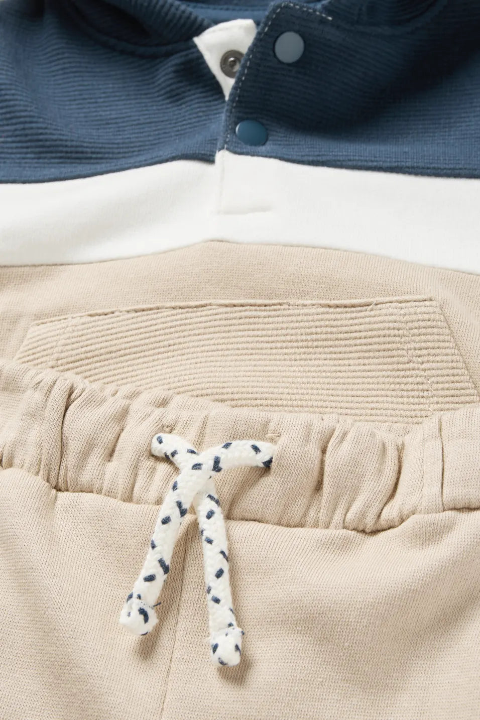 Baby outfit in soft sweat in a color block design with ribbed parts. Hoodie with snap button placket at the neckline, kangaroo pocket, small dino patch and ribbed cuffs. Sweatpants with elastic waistband, indicated drawstring and stretchy leg cuffs.