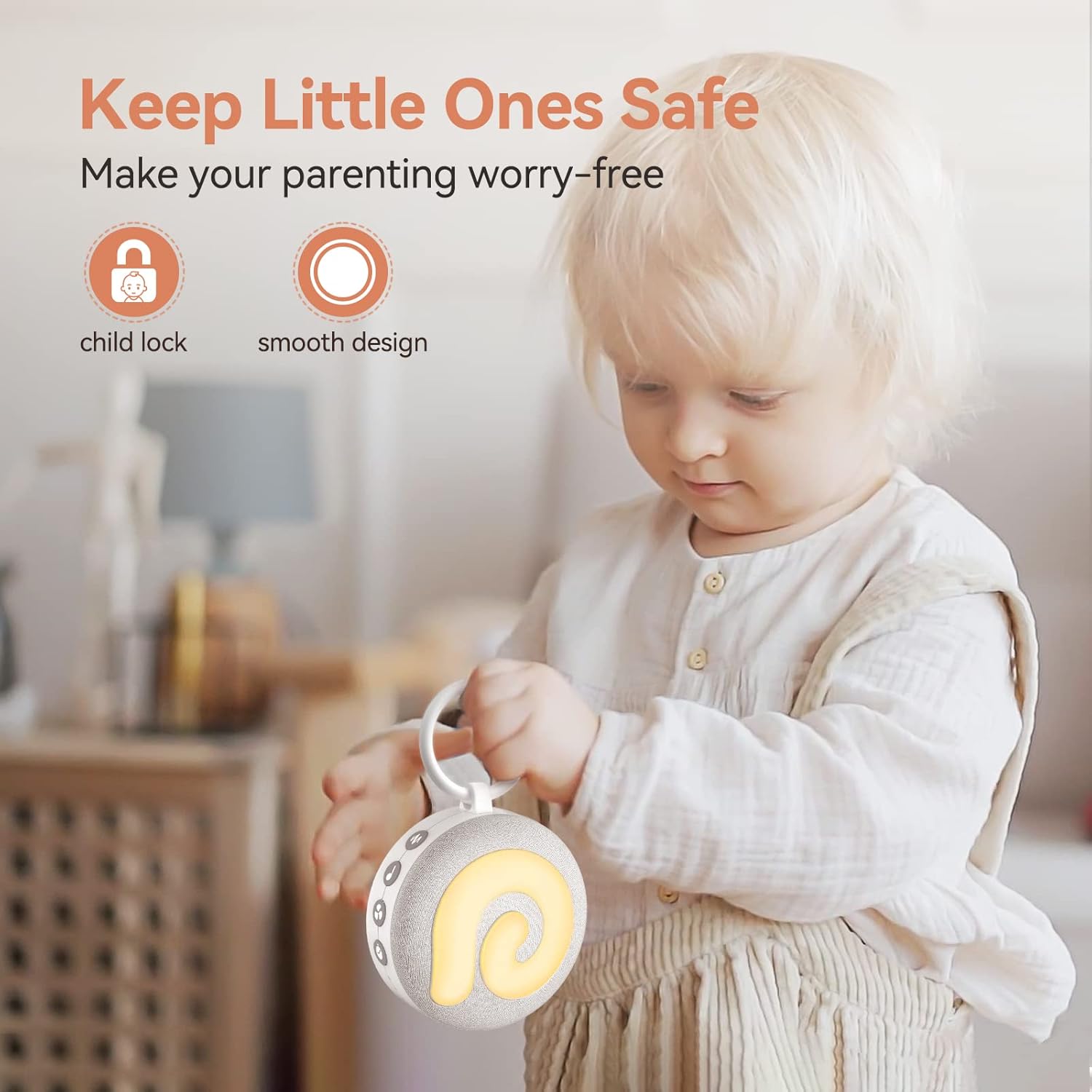 - Portable and rechargeable: the D11 music box baby white noise weighs only 140 g. The compact and lightweight design allows you to effortlessly store it in your handbag or hang it on the stroller. In addition, the D11 sound machine has practical timer functions of 30, 60 and 90 minutes as well as a child lock on the back to prevent unwanted contact by the baby. The ideal companion for travelling with the baby.