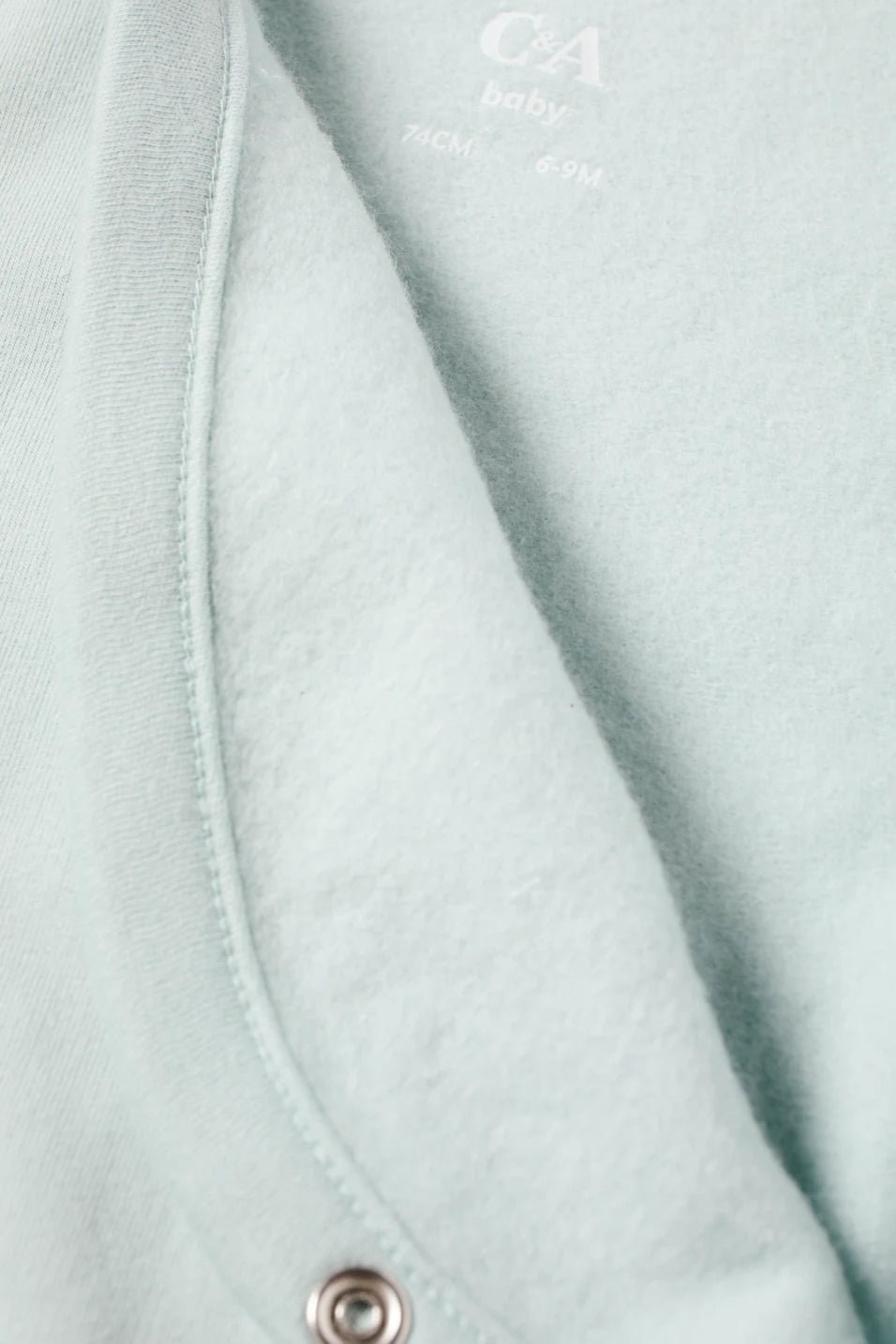 Wrap top with elephant patch, car embroidery and lateral press stud. Trousers with allover auto print, turn-over waistband and feet at the leg ends.