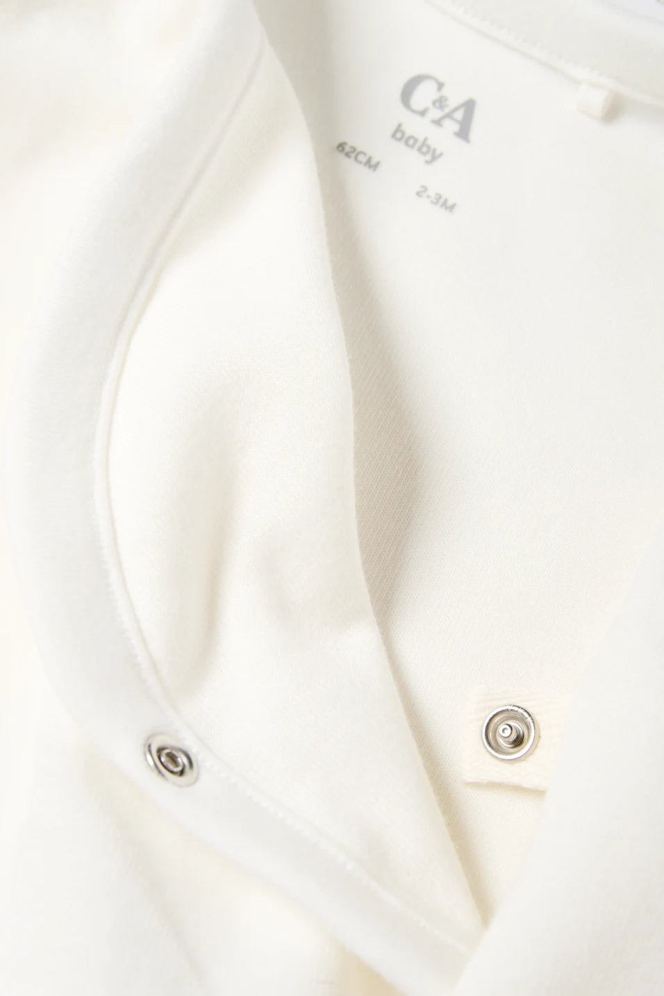 Wrap top with fox print, lettering and press-button placket on the side. Striped trousers with ribbed turn-over waistband and feet at the leg ends.