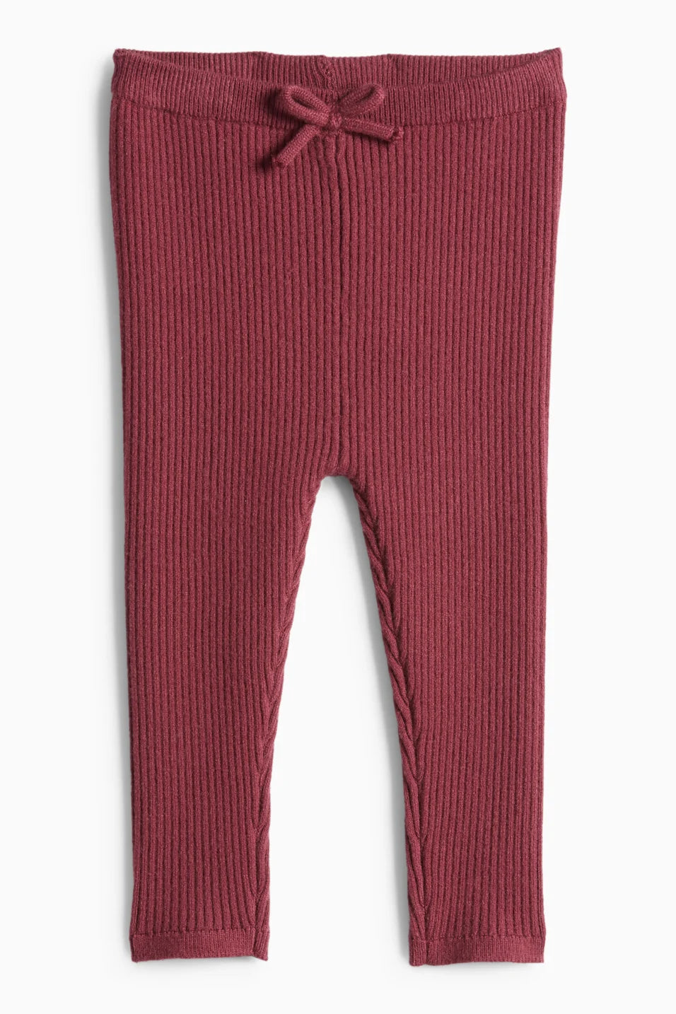 Baby outfit in soft quality. Ribbed long-sleeved jersey shirt with openwork pattern and heart print. Ruffle collar, stretchy sleeve ends and press studs in the neck. Pullover in coarse rib knit with button on the side of the neckline and side decorative bows. Ribbed knit leggings with elastic waistband and decorative bow.