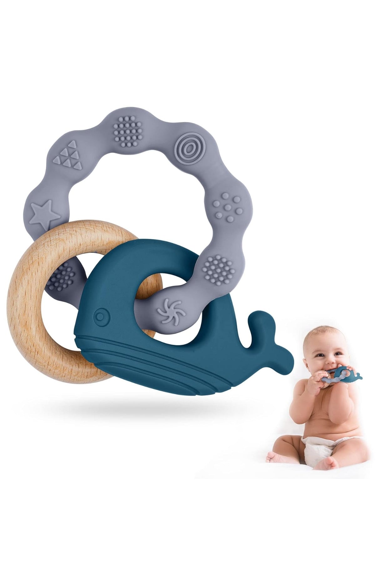 - Teething relief: the baby teething aid can help the baby relieve the discomfort of teething. The two different materials wood and teething ring give the baby different feelings. It provides a pleasant gum massage by chewing and promotes baby's teeth and gums. healthy development.