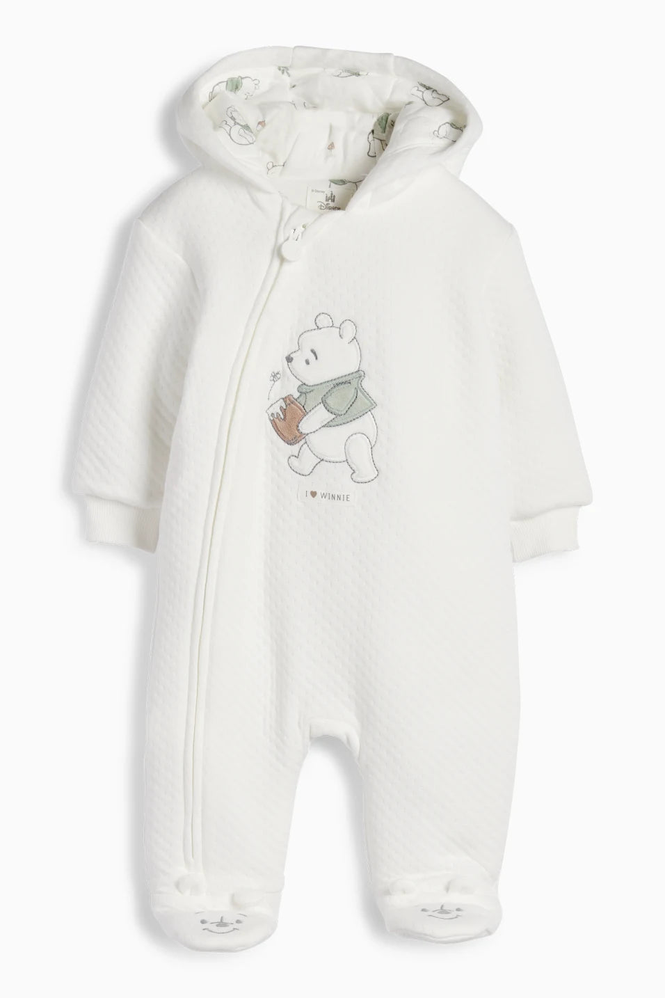 Lightly padded baby jumpsuit in soft textured jersey with Winnie the Pooh embroidery. Hood with ear application, side zipper and quilted jersey lining.