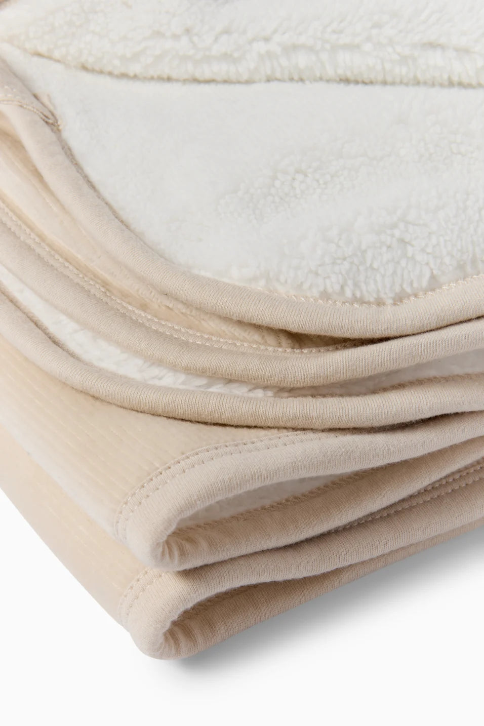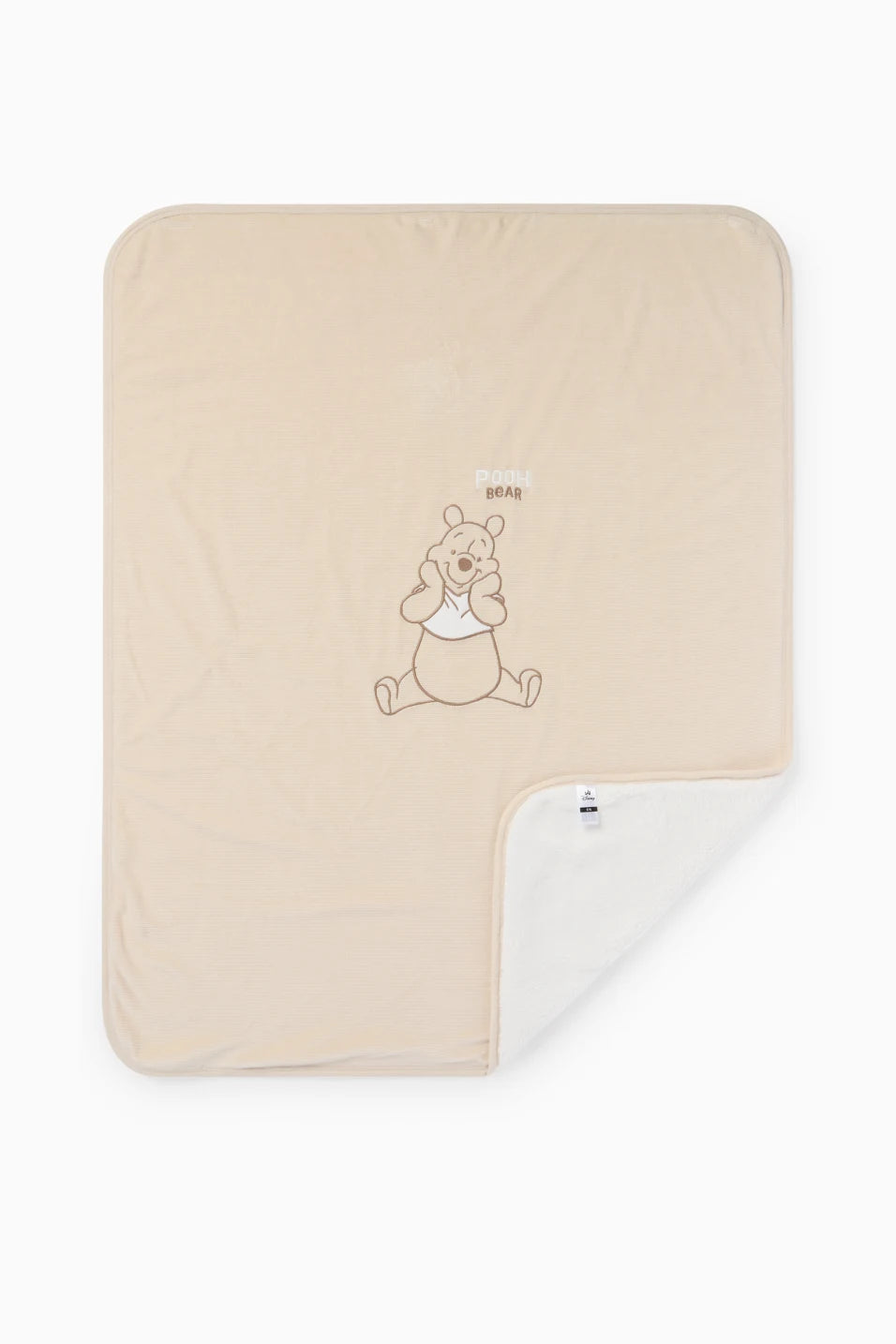 One side of ribbed Nicki with Winnie the Pooh embroidery, the other of fluffy plush. Edges bordered around the round.