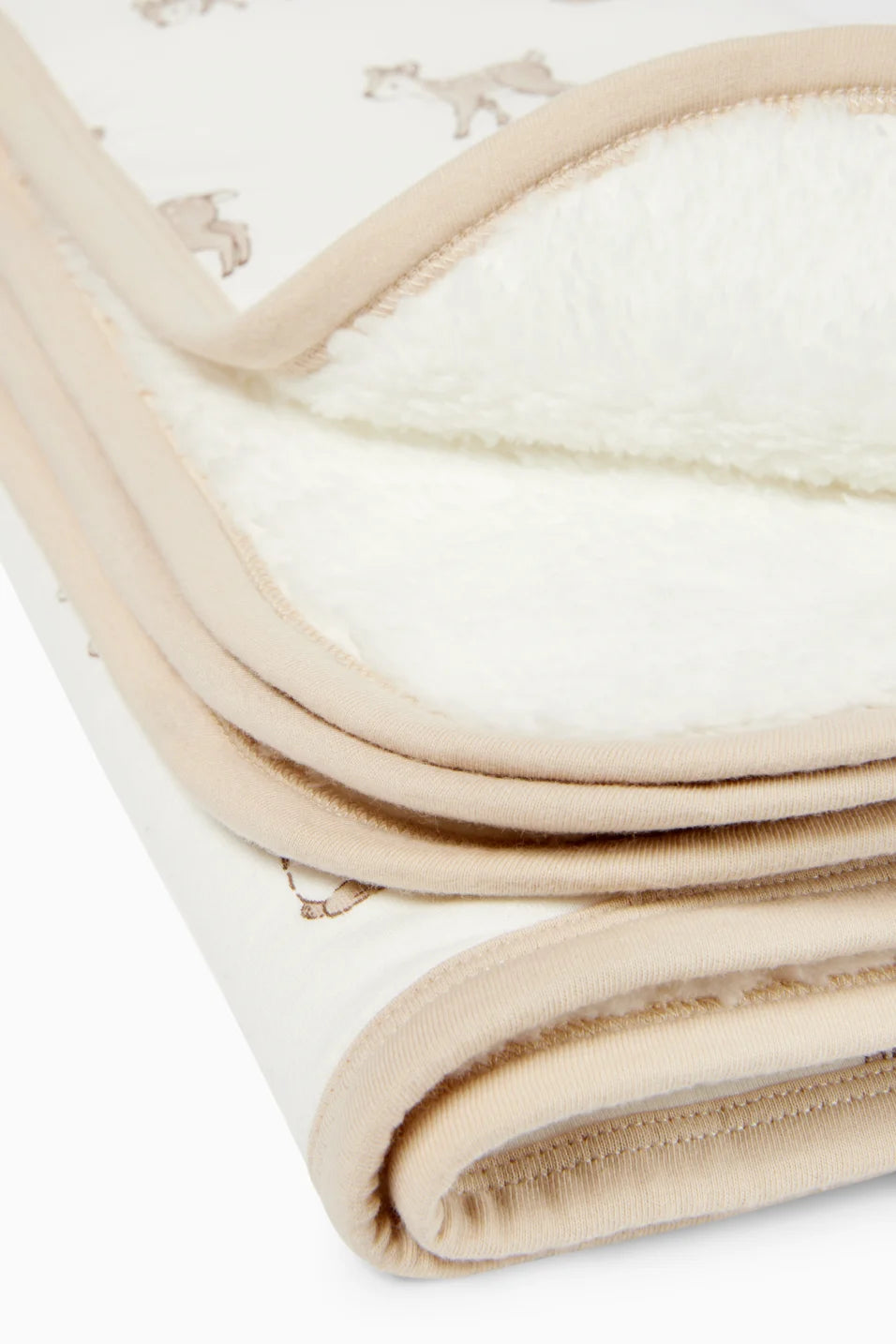 Baby blanket in soft quality. One side in jersey with fawn pattern, the other in fluffy plush. Edges bordered around the round.